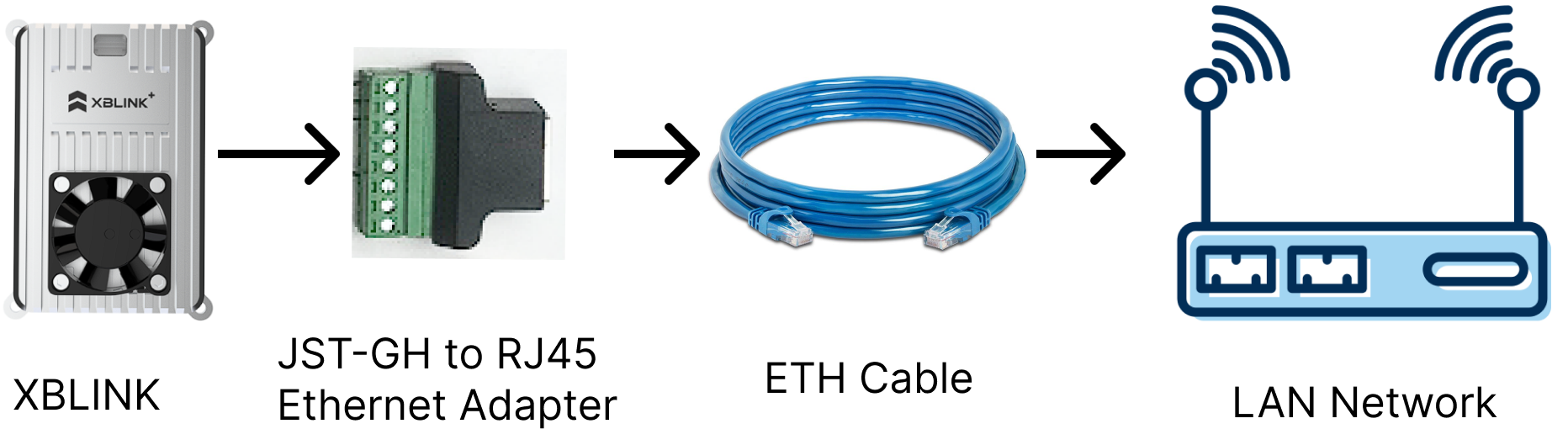 1. &#x20;Connect [JST-GH to RJ45 Ethernet Adapter cable](https://docs.xbstation.com/xblink-5g/user-manual/overview#other-not-include) by Ethernet Cable (**only supported Cat6**) to your LAN network. Then, plug it into ETH port of XBLink.&#x20;